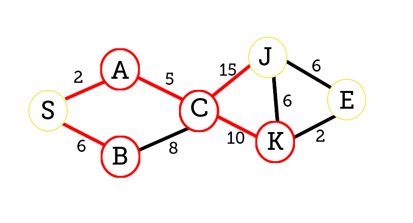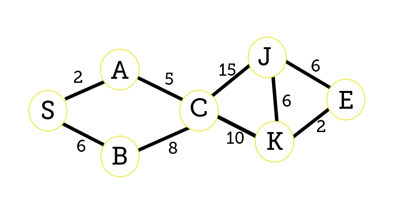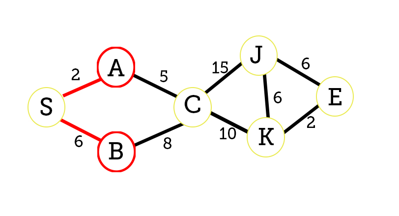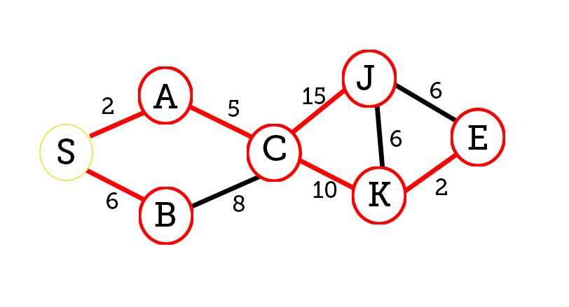 We will keep track on what is the shortest path from node S (start) to E (end) and also list the shortest path to every individual node.