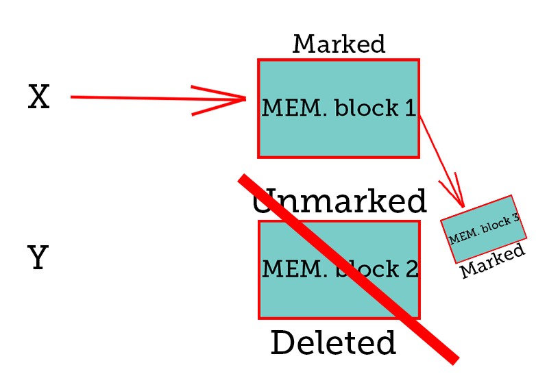 Mark stage goes through all of the accessible memory blocks, even the blocks that are not directly referenced. Here in this example if we remove the y reference to the memory block 2: